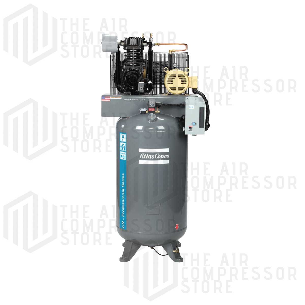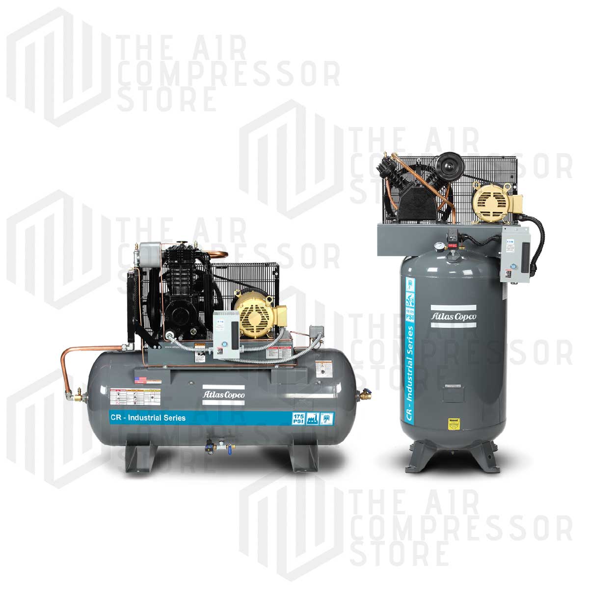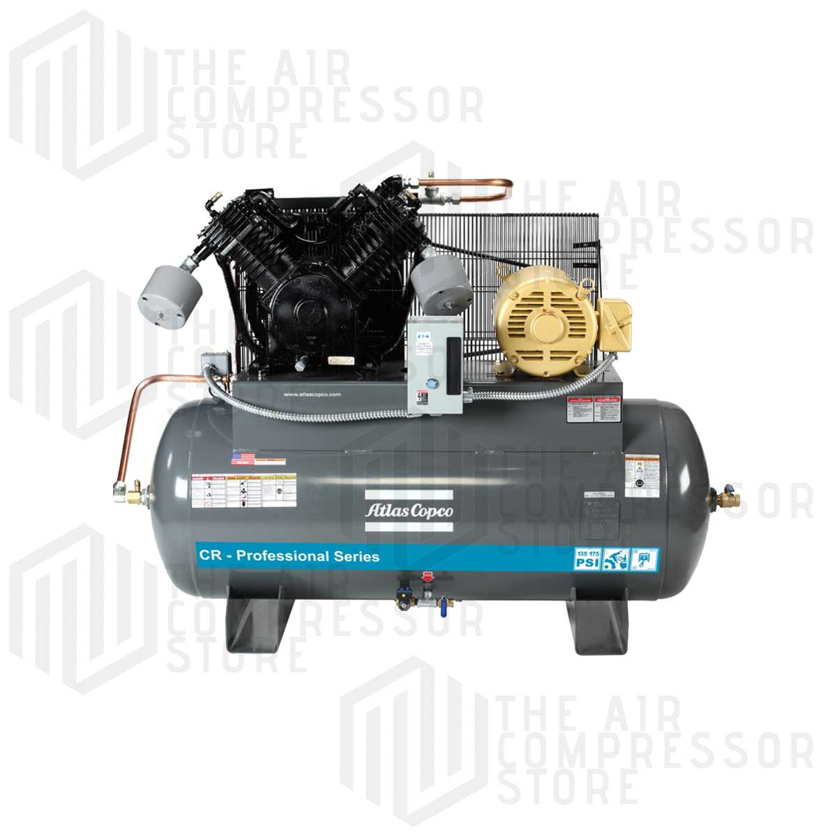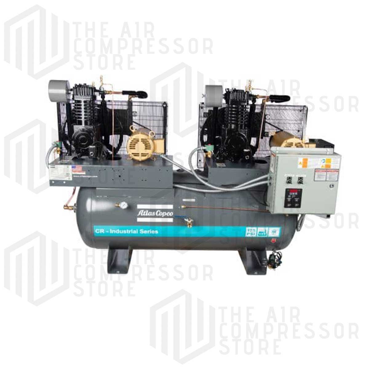 CR piston compressors include a cast-iron pump and are splash lubricated, two-stage compressors with a maximum operating pressure of 175 psi. All models feature a magnetic, electronic auto drain, low oil level switch, and belt guard-mounted aftercooler.