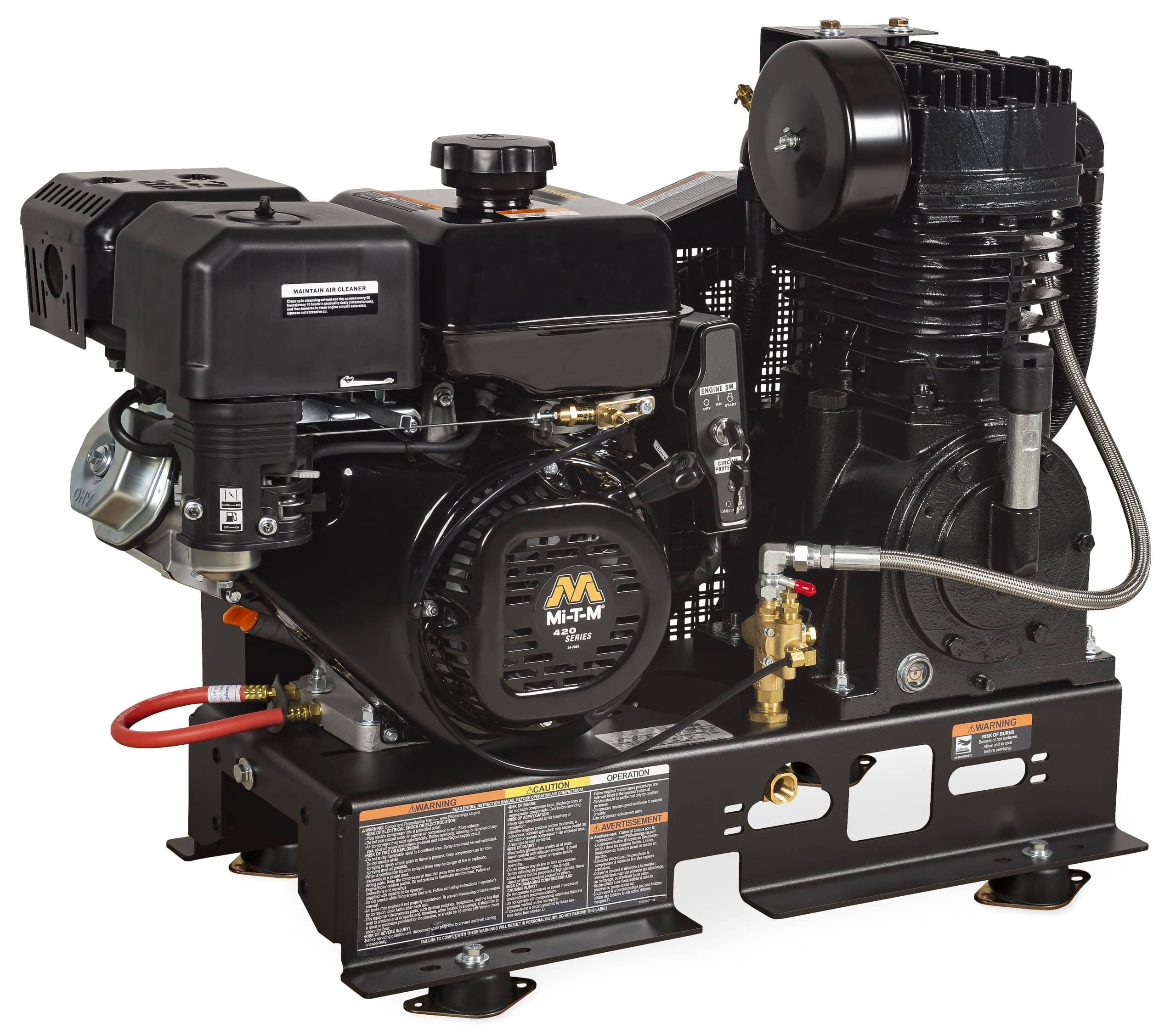 Compressor Pump: Cast iron compressor · Splash lubricated · Stainless-steel braided discharge hose · Large canister intake filter · Oil level sight indicator